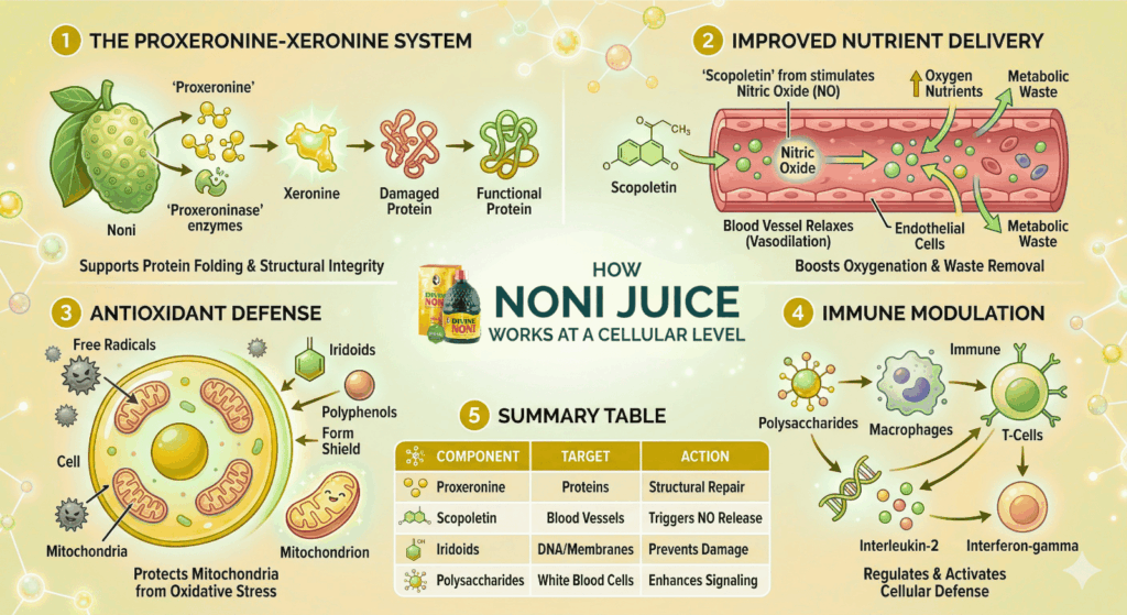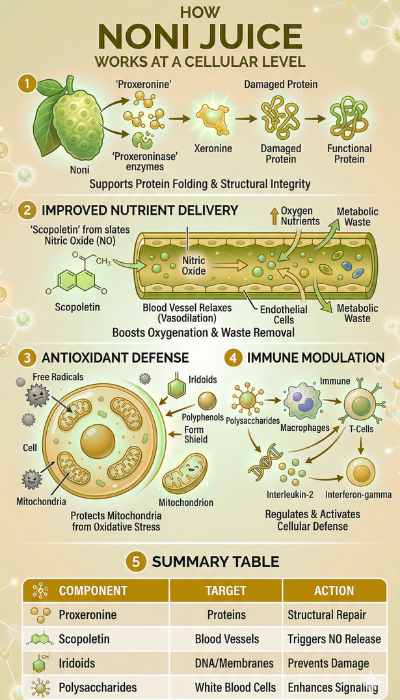 Noni juice is rich in antioxidants, vitamin C, and anti-inflammatory compounds. It may support immunity, digestion, joint health, and overall cellular wellness.